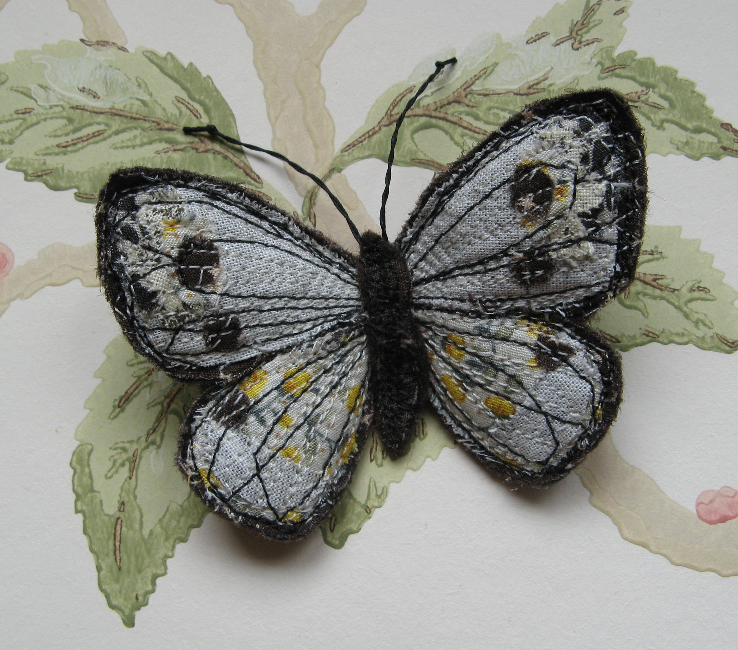 The wings are covered with layers of machine stitching and the butterfly is slightly padded and backed with felt. The antennae are made from strong button thread.